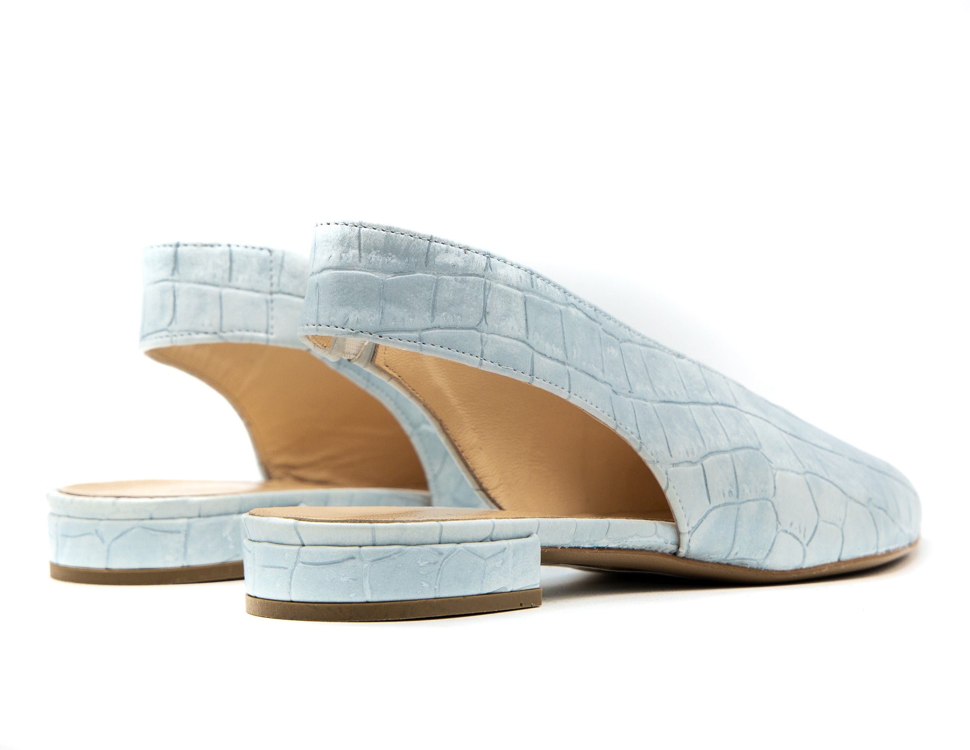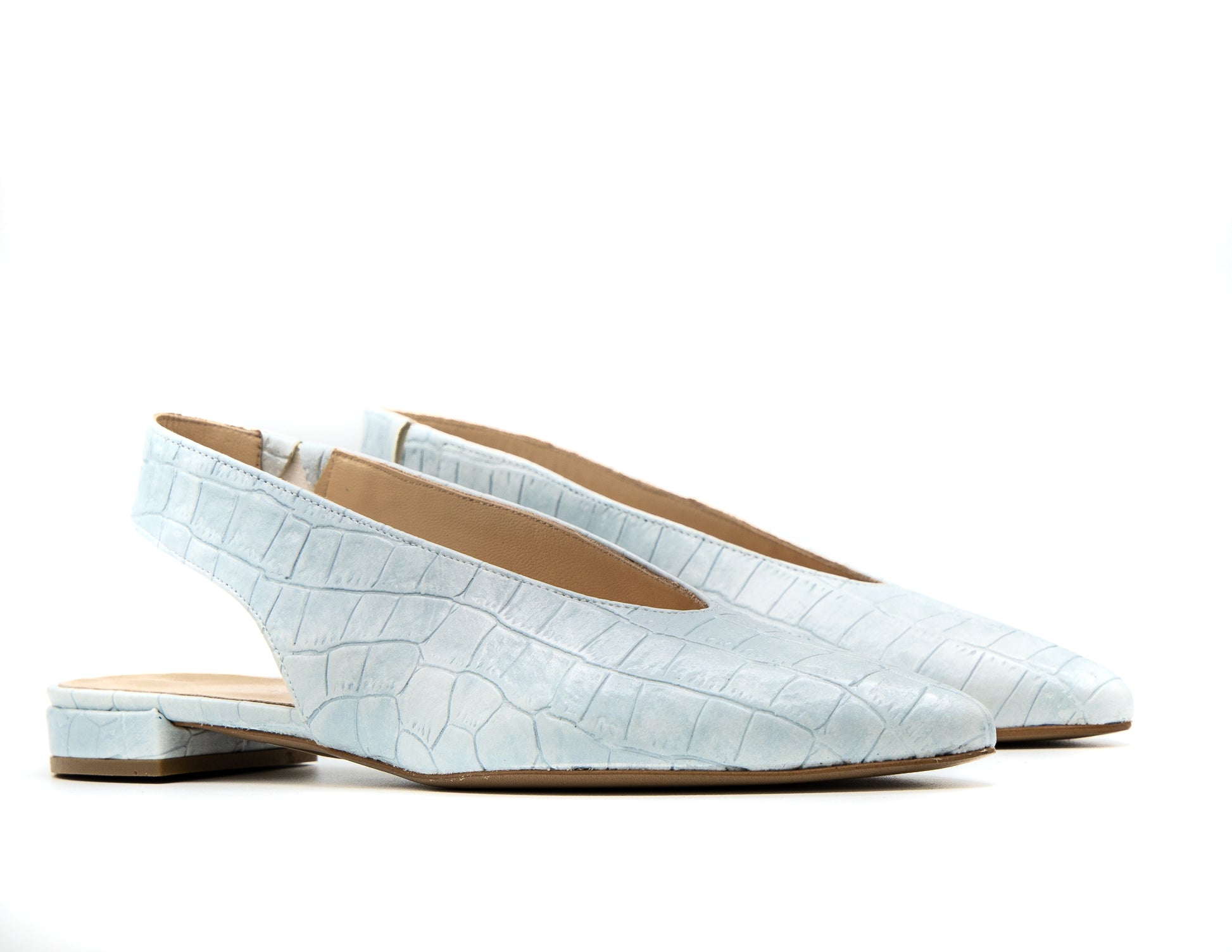 Riscopri la leggerezza con le Slingback Flat "Sylvie Milano" , che uniscono raffinatezza e comfort in una veste pastello esotica.Realizzate in pell con un'elegante lavorazione effetto coccodrillo , queste slingback si presentano in un delicato azzurro cielo pastello . La texture 3D aggiunge un lusso discreto, mentre la punta affusolata e il taglio a V slanciano la silhouette. Il tacco basso e squadrato 1 cm assicura il massimo comfort per tutto il giorno. Il cinturino elastico garantisce una calzata sicura . Ideali per la primavera/estate, l'ufficio o un brunch , sono il must-have per un guardaroba fresco e di tendenza.